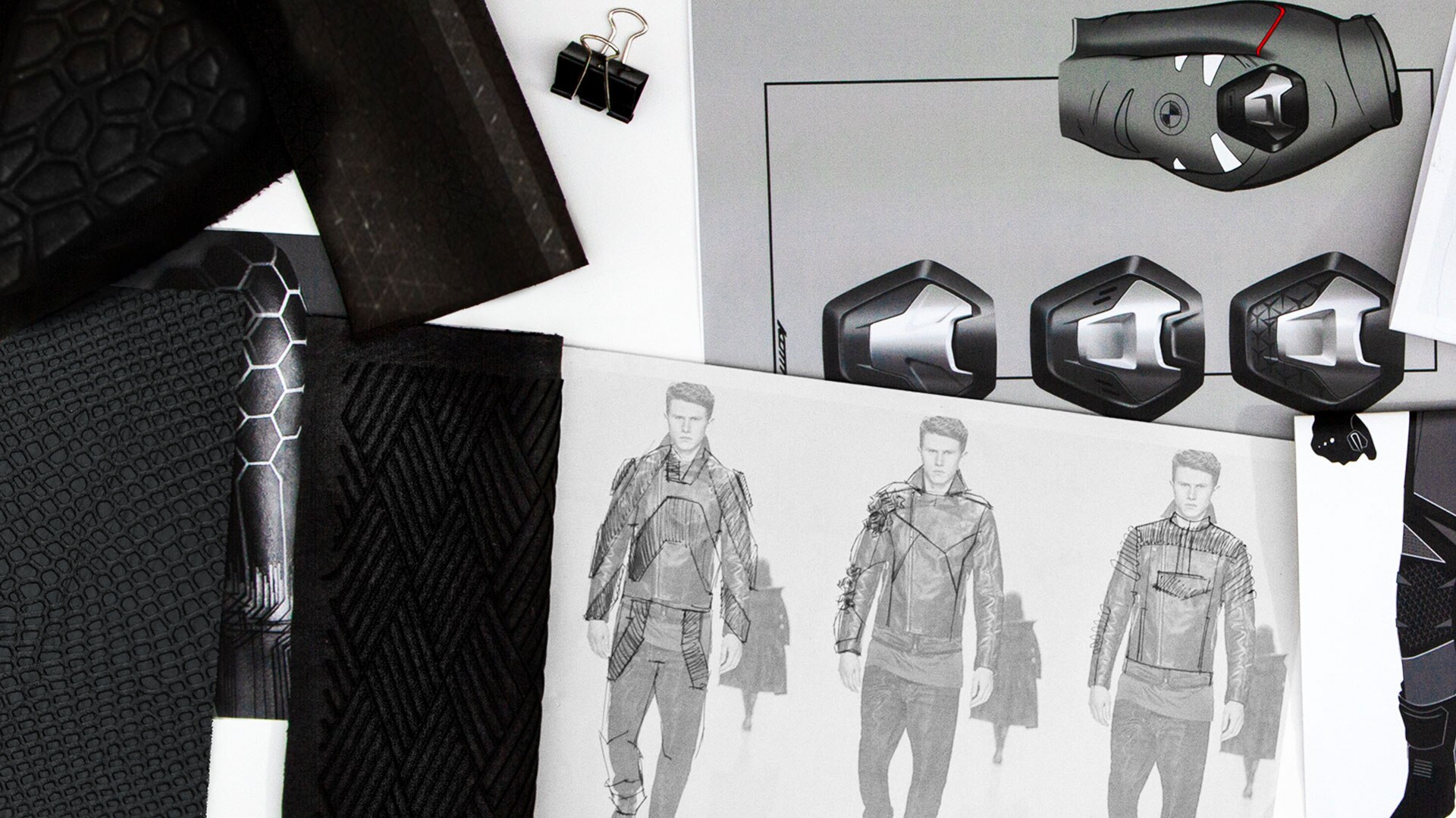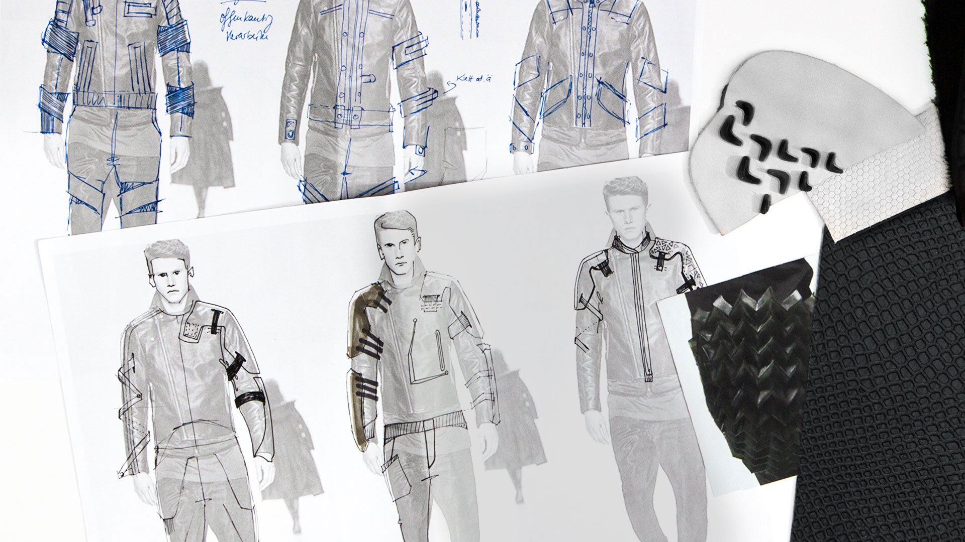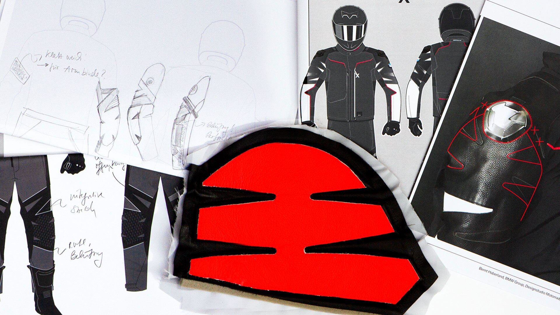 Al principio, nuestros desarrolladores de producto y diseñadores tuvieron la idea de establecer zonas de movimientos fluidos como, por ejemplo, en brazos, hombros y rodillas con módulos individuales (integrados o superpuestos). El objetivo era que la sujeción de las protecciones fuera ligera para permitir movimientos deportivos. Pero, ¿cómo? La solución: Con la colocación de un tipo de técnica de bandas reforzamos el traje en puntos que necesitan protección (en nuestro caso lo hacemos con cuero) y dejamos libres determinadas zonas para poder garantizar una libertad de movimientos óptima. Así surgió el "concepto ergonómico" y con él el diseño final del traje.
